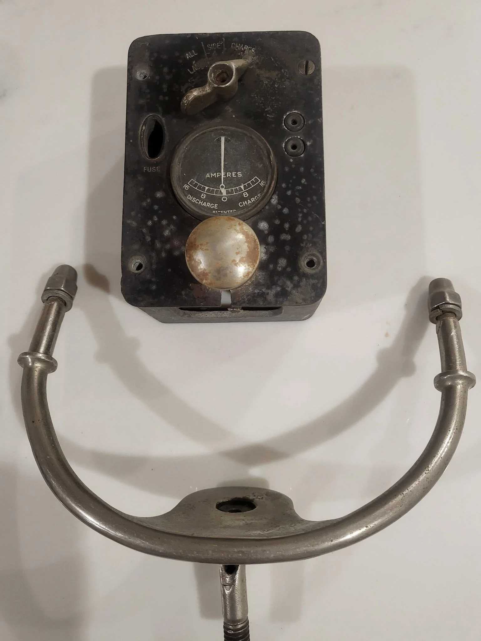 Vintage or earlier plated brass windscreen frame with glass good condition. size 121 cm x 40 $200, Switchbox $125. Bosch pair of headlight mounts. $100.